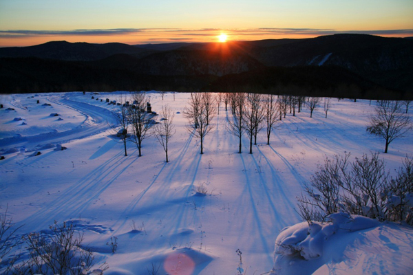 大雪纷飞,刚落地的雪片也会被飞驰的列车带起,在车身周围扬起一圈雪雾。以日出日落为背景,火车的色彩在白茫茫中格外醒目。